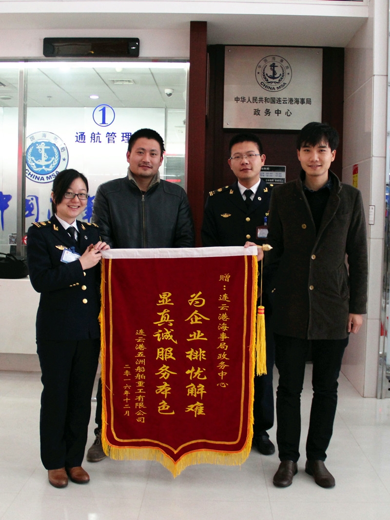 12月26日上午,连云港五洲船舶重工有限公司送来“为企业排忧解难显真诚服务本色”的锦旗,对政务中心一直以来的优质、便捷、高效、热情的服务表示感谢。
