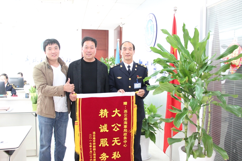 10月31日下午,连云港京祥船舶工程有限公司法人刘毅将一面印有“大公无私精诚服务”的锦旗送到了政务中心,对政务中心一直以来提供的高效优质服务表示感谢。