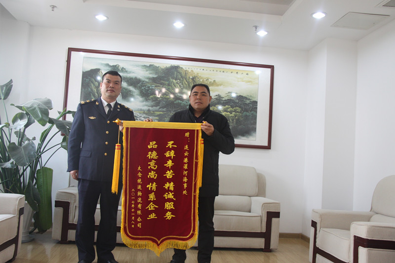 11月28日下午,太仓统运物流有限公司段经理一行来到灌河海事处并赠送了题为“不辞辛苦精诚服务品德高尚情系企业”的锦旗。段经理代表太仓统运物流有限公司向灌河海事处在“4.29”事故中尽力尽责的协调和调查处理工作表示感谢。