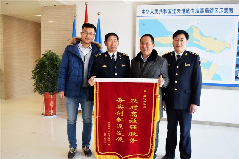 1月23日上午,中创物流(连云港)有限公司史强军总经理来到墟沟海事局,将一面绣有“务实创新促发展及时高效强服务”的锦旗送到墟沟海事局人员手中,并对墟沟海事局一年来对该公司在执法过程中的优质服务和廉洁高效的工作态度表示由衷地感谢。